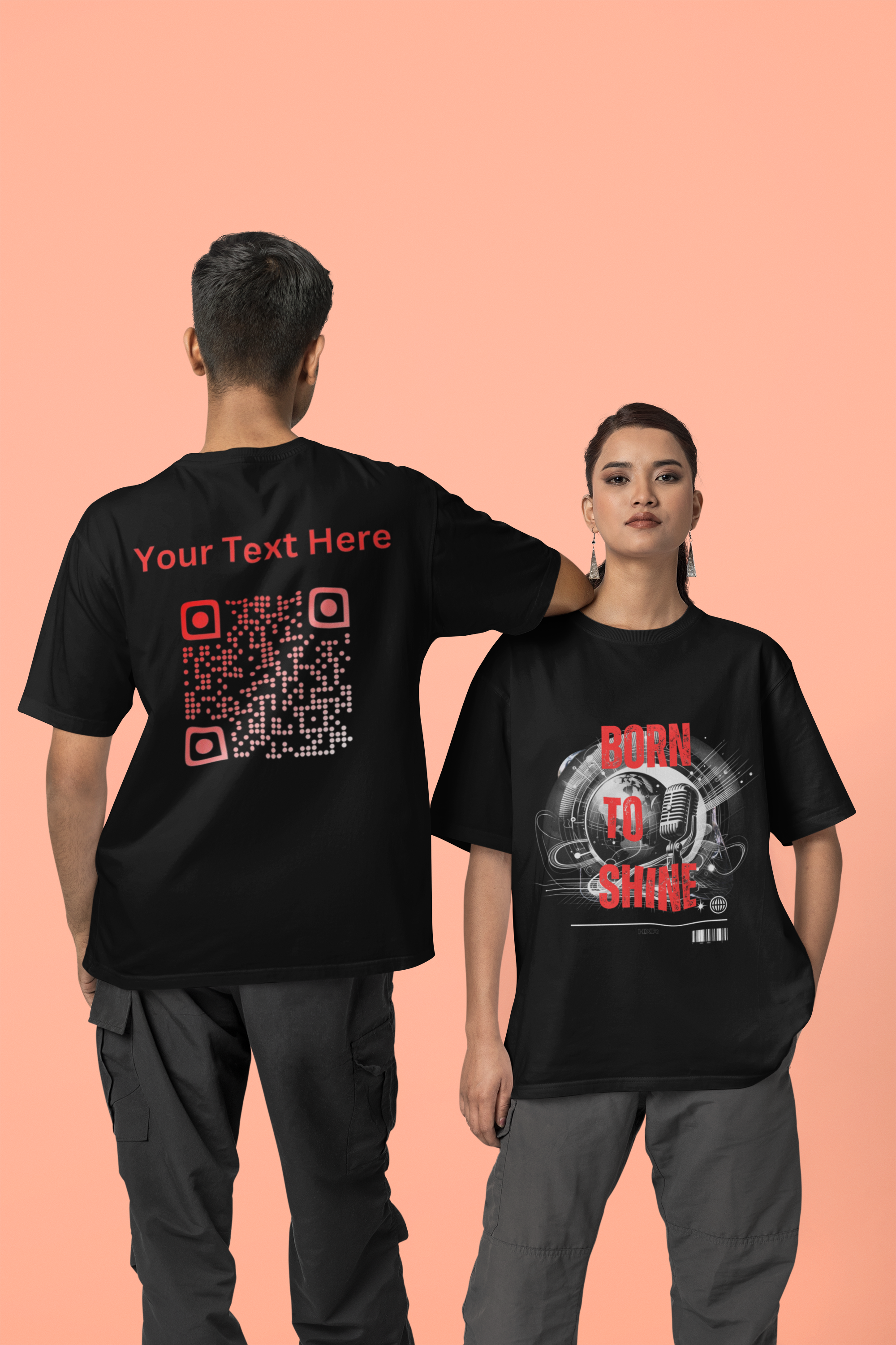 Elevate your street style with our ‘Born to Shine’ Tech Oversized T-Shirt. This striking black t-shirt features a bold graphic design that showcases a microphone set against an urban backdrop.